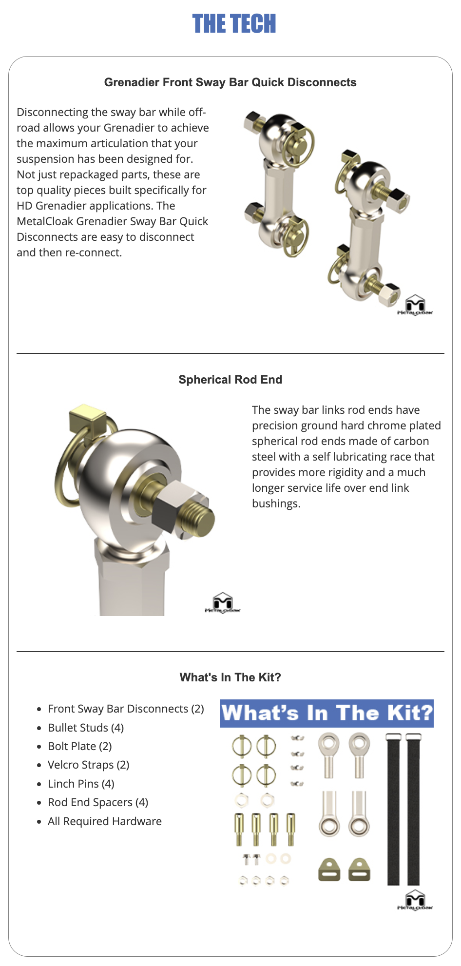 MetalCloak 的 INEOS Grenadier 前防傾桿快速解鎖套件利用堅固的 3/16 英吋厚鋼製延伸支架與高強度零件打造,可在需要時手動解鎖前防傾桿,讓您的 Grenadier 在越野時達到最大懸吊行程。輪胎得以緊貼地面,提升車輛穩定度與通過性,讓您在面對崎嶇路況時保持前進動能。
