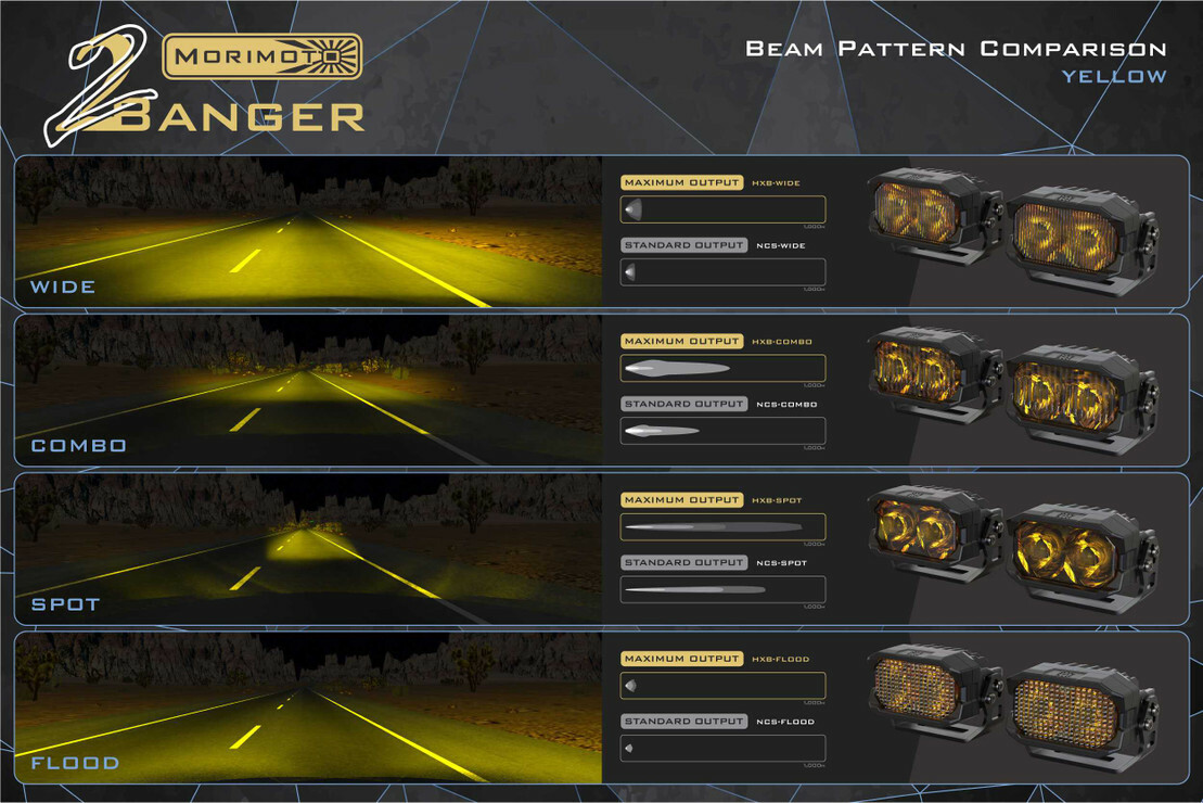 所有Banger系列都是由零開始打造設計的。 1Banger的每個元素都是很獨特的。 LucidShape鏡片被用於優化Osram最現代、流明密集的LED晶片。 SolidWorks分析對熱動力學進行了優化。 白色或黃色輸出和四種不同的光束模式(Wide/Fog,Spot,Combo,和Flood)- 綜上所述,1Banger可以滿足每一個性能需求和駕駛風格。
