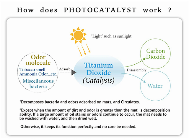 HotField將光觸媒塗層穩定得結合在地毯上,光觸媒塗層會跟光發生除箘/除臭反應,除箘/除臭反應不需要大量陽光,穿透