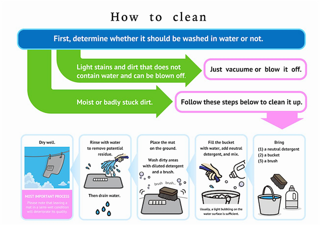 2:如果是沾到液體污垢,例如泥巴水,可使用刷子以及中性清潔劑往重點污垢區刷洗,然後沖水,晾乾即可。