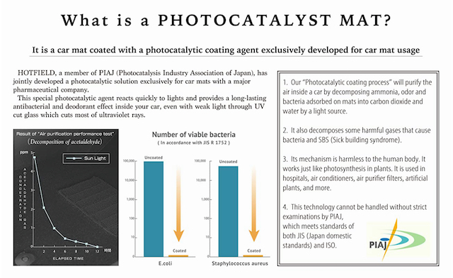 Hot-Field全系列的汽車地毯都有日本PIAJ (photocatalysis Industry Association of Japan) 認證的光觸媒功能。